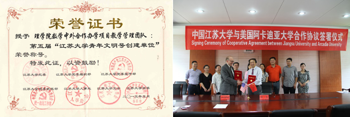 江苏大学与美国阿卡迪亚大学合作举办数学与应用数学专业本科教育项目,经教育部批准(批准书编号: MOE32US2A20121231N),该专业招生方式为纳入国家普通高等教育招生计划,参加全国普通高等学校统一入学考试。该专业自2012年起正式招生,旨在培养拥有扎实的数学和经济学理论基础和借助数学、金融、计算机技术解决实际问题能力,具有国际视野、通晓国际规则的高级专门人才。