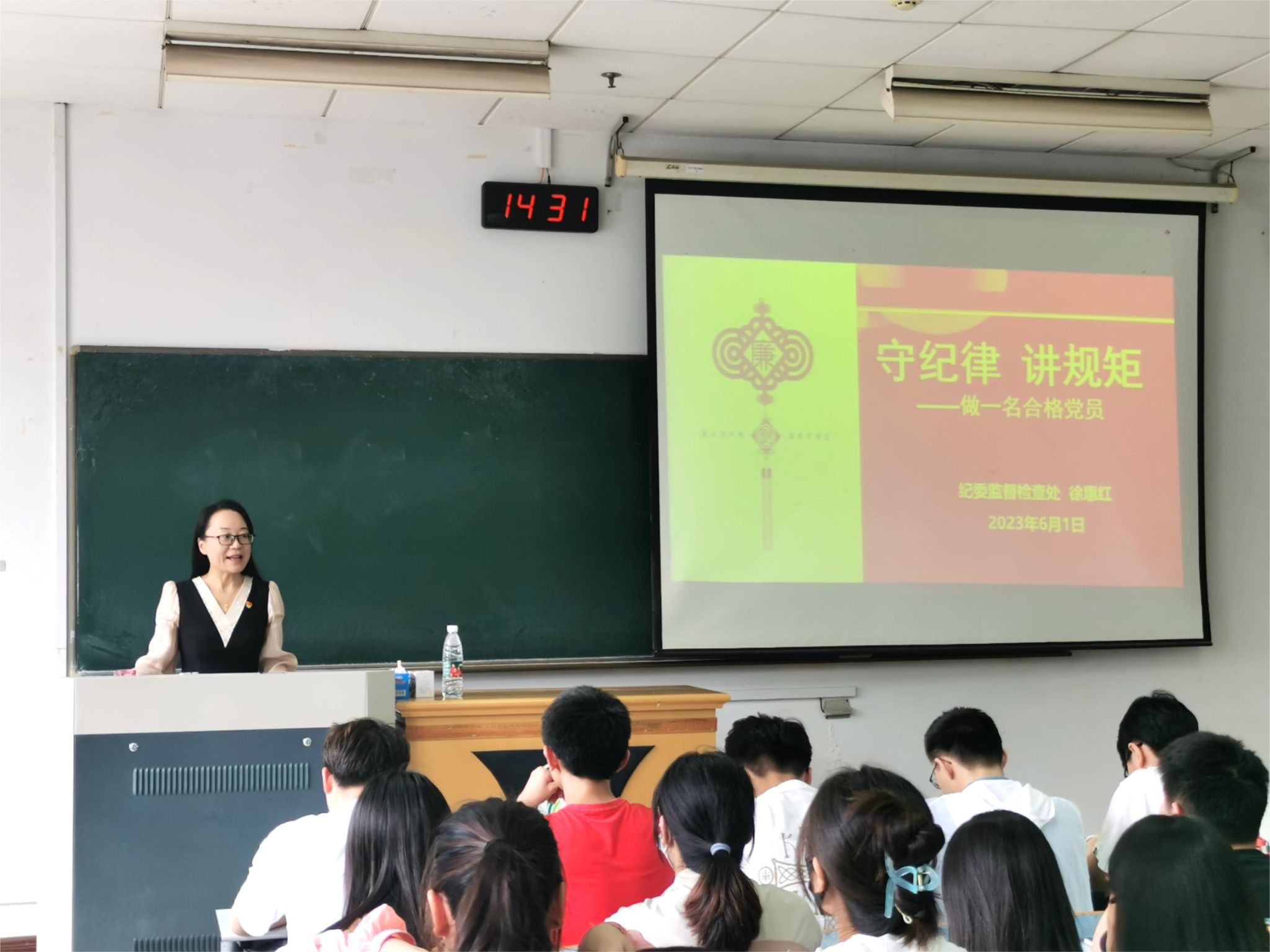 6月1日,3522vip浦京集团官网在三江楼206教室举办“守纪律 讲规矩——做一名合格党员”党课。该党课邀请校纪委监督检查处处长徐惠红主讲,学院党务办主任贡崇颖主持,学院党员、入党积极分子参与。