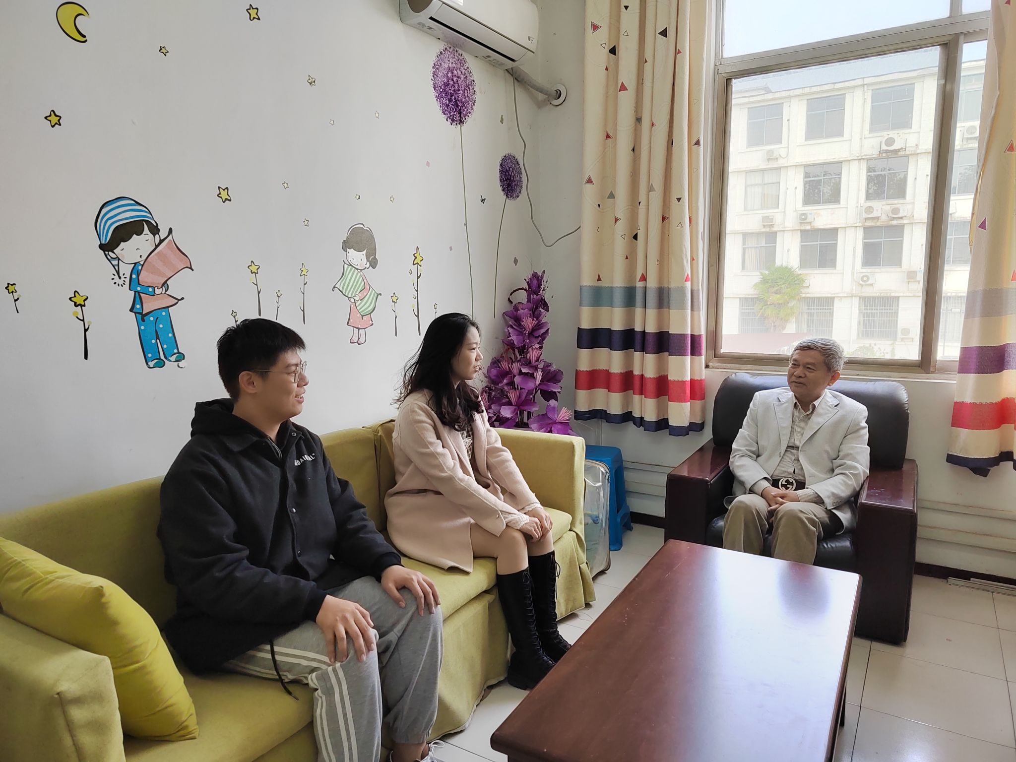 3522vip浦京集团官网关工委重视“三全育人”工作,认真落实老教师结对指导学生班级,11月4日上午学院关工委老教师与数学与应用数学(中外合作办学)1901班(以下简称:应数国际1901)的两位学生代表胡俊朗、高珊珊,在学院关爱谈心屋进行亲切的交谈。